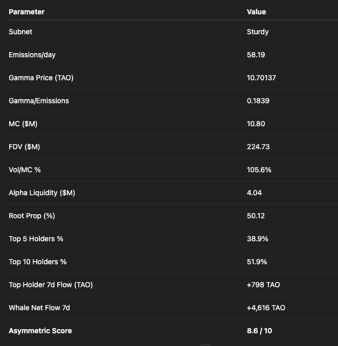 🟢 BUY / ACCUMULATE — Sturdy is one of the most complete AI x DeFi subnets with live product, validator saturation, whale inflows, and breakout gamma. Well-positioned as Bittensor’s flagship DeFi optimizer.